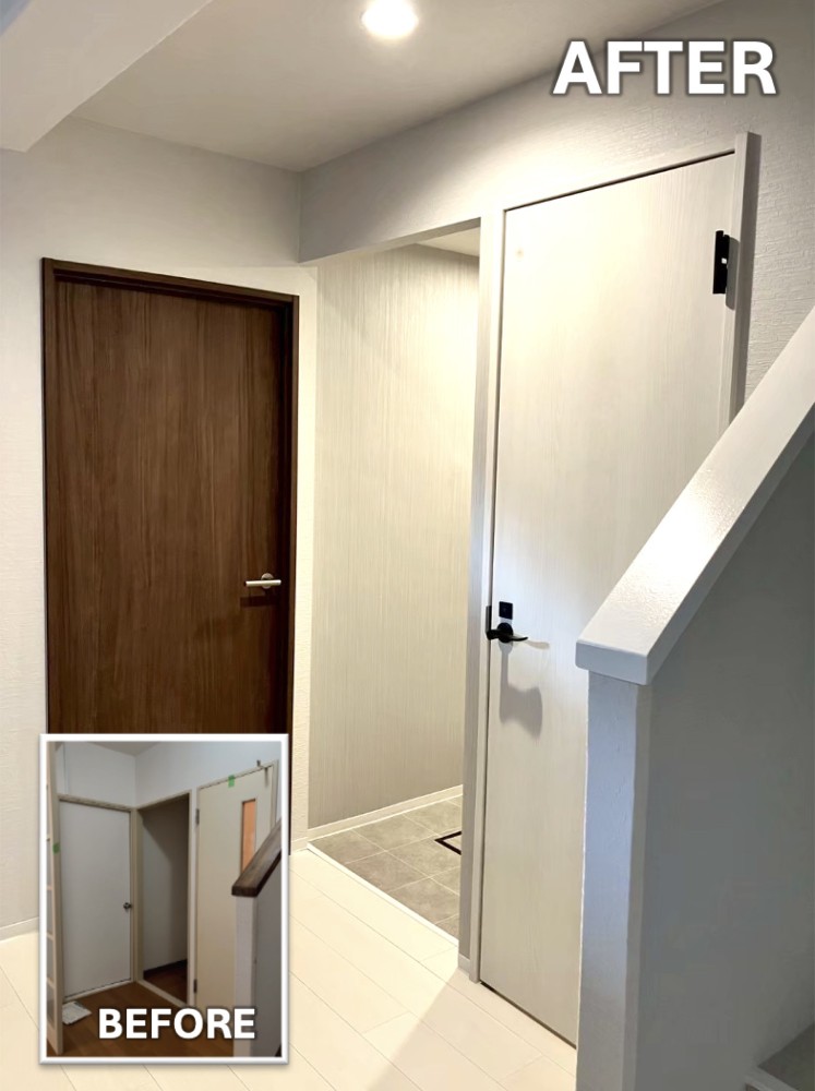 古い襖や収納扉を撤去し、ウッドとホワイトを基調としたモダンな空間に。玄関床には上品なタイル、壁にはアクセント照明を設置し、帰宅時の気分が上がる明るく開放的なエントランスを実現しました。