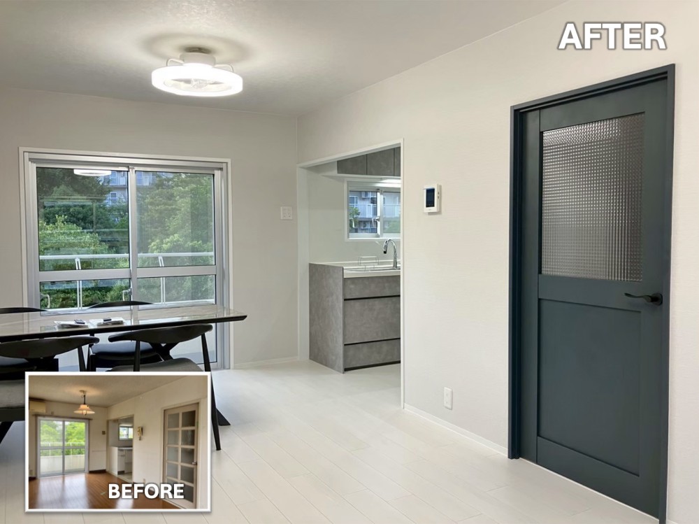 古い照明や建具を一新し、明るく開放的なLDKに。チェッカーガラスのドアがアクセントとなり、空間に個性をプラス。家具の配置がしやすいシンプルな空間設計で、家族それぞれの暮らし方に寄り添います。